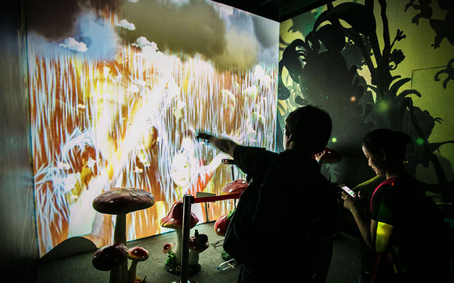 多媒体互动投影系统采用先进的计算机视觉技术和投影显示技术来营造一种奇幻动感的交互体验,系统可产生各种特效影像,使观众置身其中,参与互动,趣味十足,让你进入一种虚实融合、亦真亦幻的奇妙世界。该项目包括水波纹翻转、碰撞、擦除、避让、跟随等几十种效果。观众通过身体动作来与地面的图像进行互动,地面互动投影系统能带给观众一种全新的互动体验。